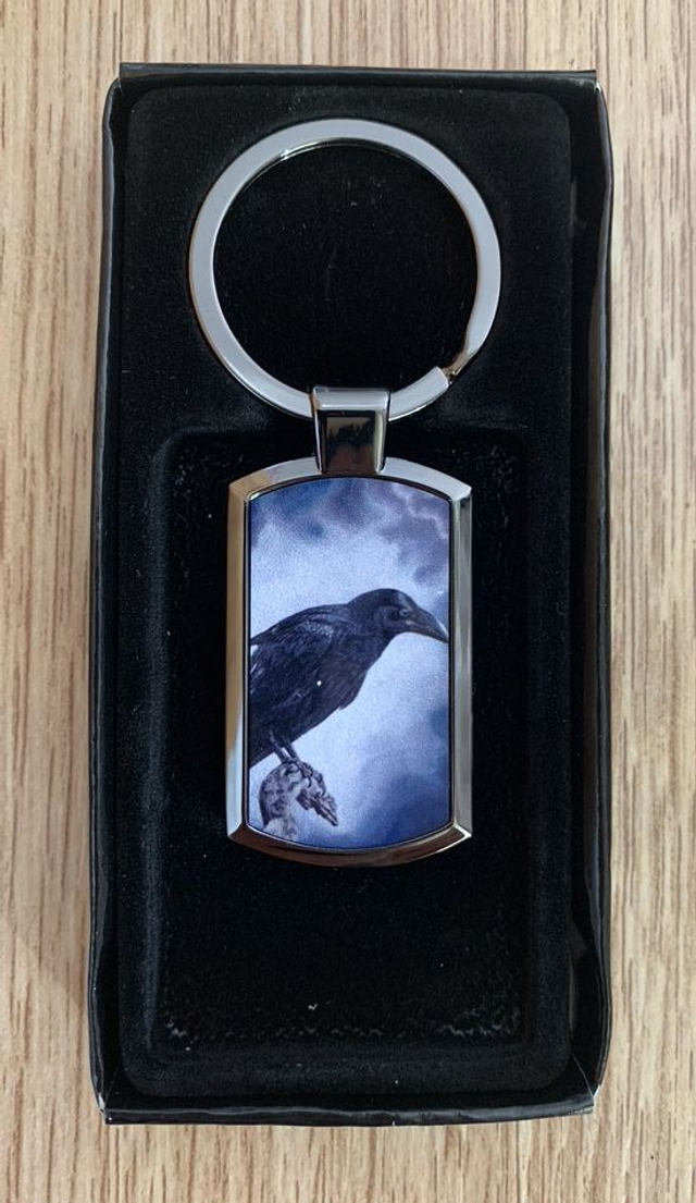 Metal key ring with raven design on front. Tag approx 42 x 25mm, total size including ring approx 75 x 31mm. Comes in a black gift box.Lovely gift for a raven lover!